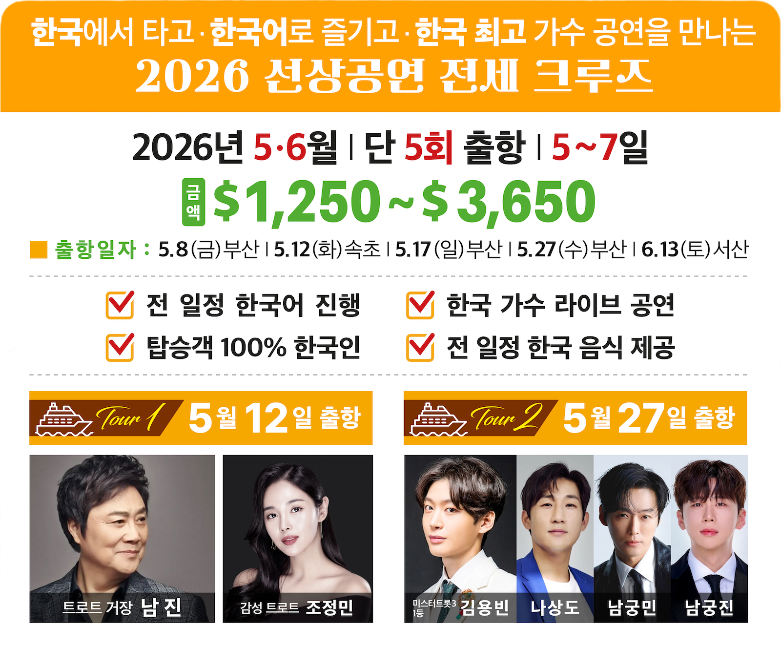 | 선상 특별 공연 - 트로트 거장/남 진, 감성 트로트/조정민 | ||||